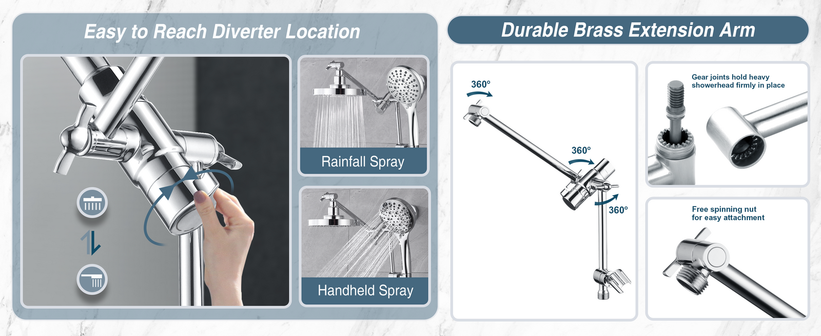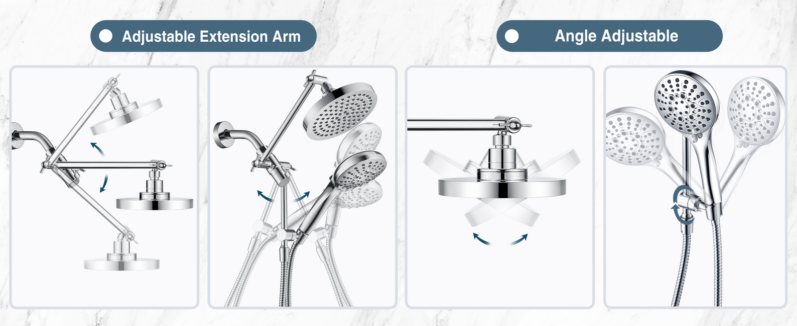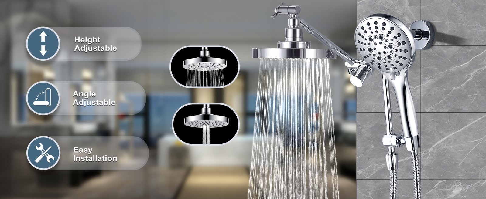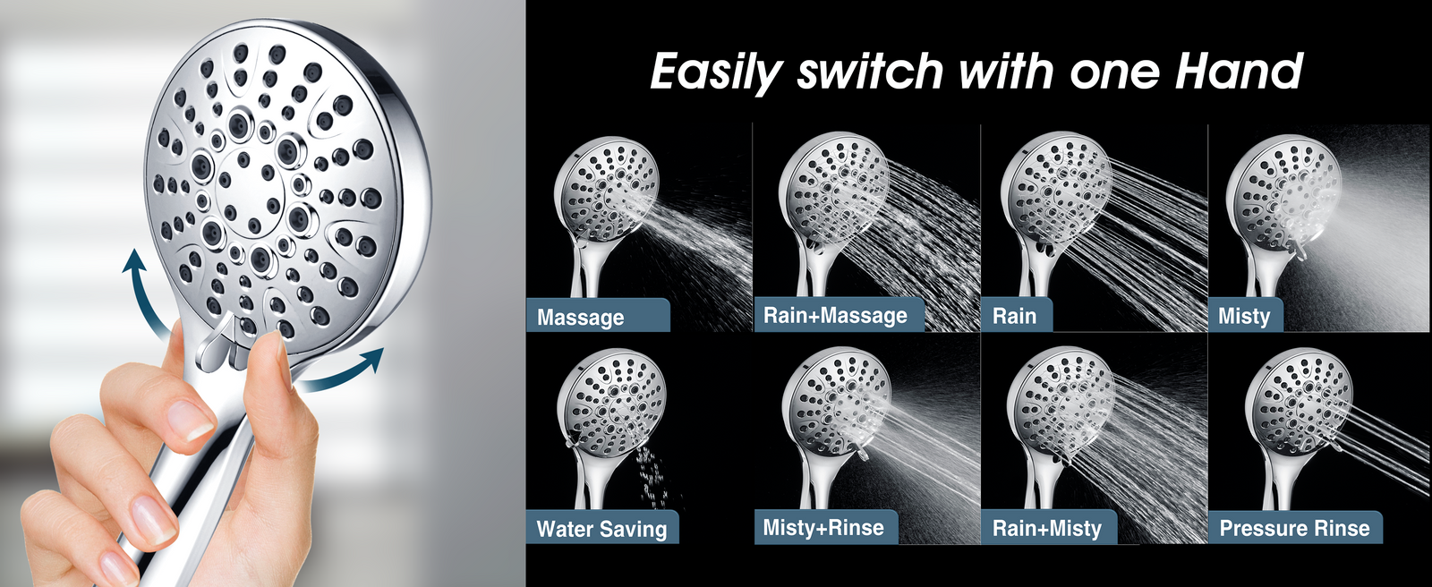 - RAIN SHOWER MASSAGE AND TURBO SPRAY MODE- adjustable settings including rain spray , water saver turbo mode or massage. Adjustable ball joint allows easy and flexible adjustment to achieve the perfect angle for your bath area. The showerhead massage is the control that switches the water from a steady stream to apulsating jet spray.