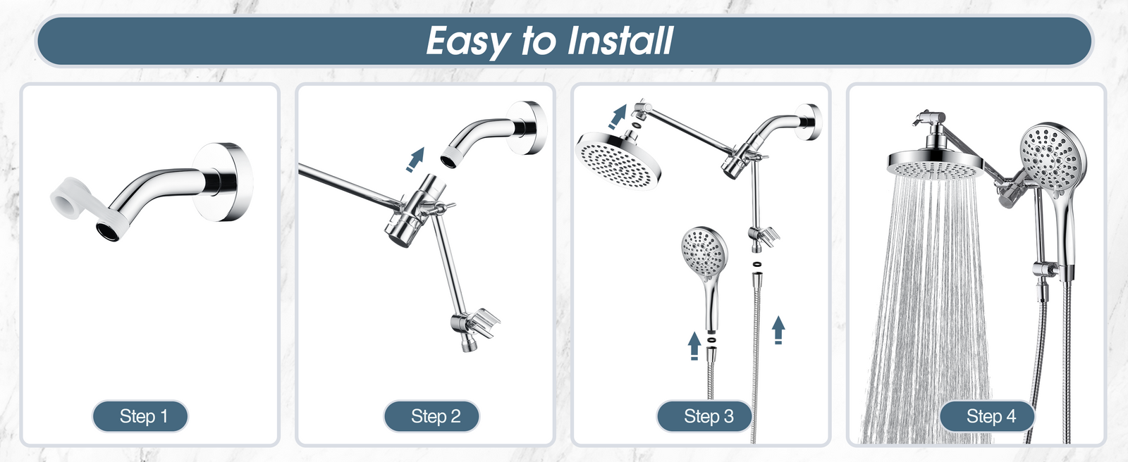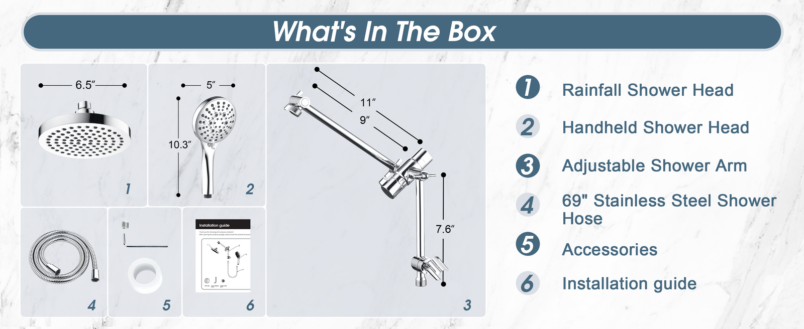 - PACKAGE INCLUDES - Flow restrictor & sand filter disk, high pressure all-inclusive showerhead kit, includes everything our customers need for hassle-free installation. Complete with 5ft stainless steel shower hose, shower arm mount, two rubber washers and a step-by-step installation guide and for a limited time only free Teflon plumbing tape.